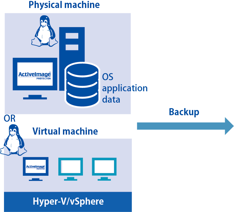 Ensure full-state recovery ActiveImage Protector™ backs up your entire hard disk including the operating system in a single operation. In the event of a hardware failure, the system can be restored to a different physical machine or a virtual machine. |
