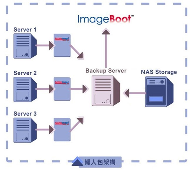 客戶主機包含:虛擬Host、一般性伺服器、桌機、儲存設備,利用整機式系統備份軟體ActiveImageProtector,將資料備份到檔案伺服器上,同時抄寫一份複本至NAS上,若伺服器發生問題時,即可進行異機還原與快速虛擬開機(ImageBoot)接手服務。