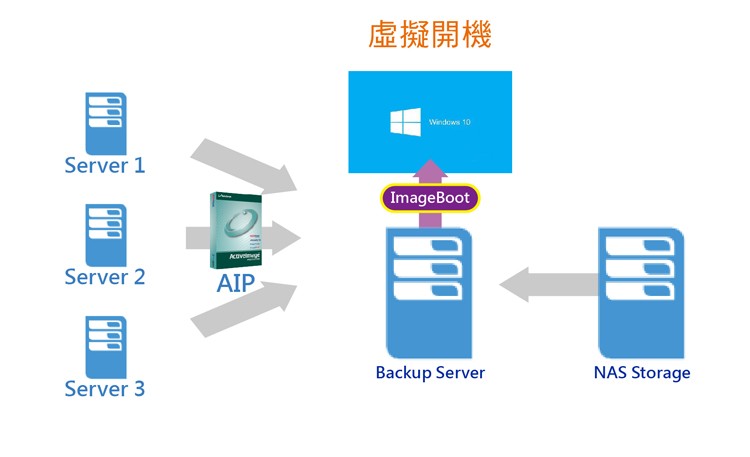 其主機包含:一般性伺服器,利用整機式系統備份軟體ActiveImageProtector,將資料備份到檔案伺服器上,同時抄寫一份複本至NAS上,若伺服器發生問題時,即可進行異機還原與快速虛擬開機(ImageBoot)接手服務。