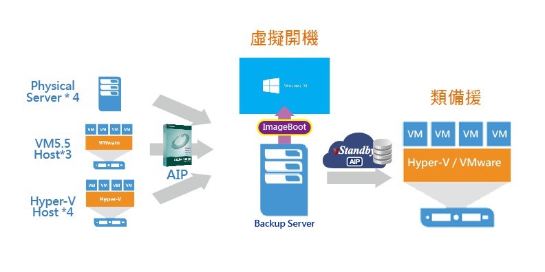 基於法規要求,不只是有備份就好,每到一定時間就要執行災難演練,六都衛生政府機關的IT人員非常困擾,在過去的機制,當要執行災難演練就要找出一台空閒機器,將備份檔還原至目的端,備份若執行一天,還原就需要一天,甚至還需要請廠商到場協助才能完成。採用 ActiveImage Protector 時,只要使用dAIP免費備援套件ImageBoot虛擬開機的功能,搭配Hpyervisor來掛載開機備份的時間點Recovery Point,過程僅須花費5-15分鐘,就能把備份的時間點Recovery Point在虛擬環境中開機來驗證備份檔案完整性。如欲災難發生欲做緊急接手的狀況也是如此操作,ImageBoot虛擬開機擁有智慧化保存異動檔的機制,能自行產生關機前最新的異動檔案,意即不需要另外再操作一次備份工作,只需將關機時產生的備份的時間點Recovery Point還原至原本故障機器,有效減少伺服器故障時的Down Time時間,並可於修理故障機器的同時使用ImageBoot虛擬開機持續接手前端服務,達到營運不中斷。