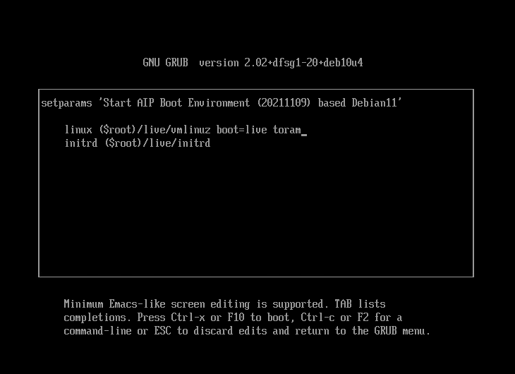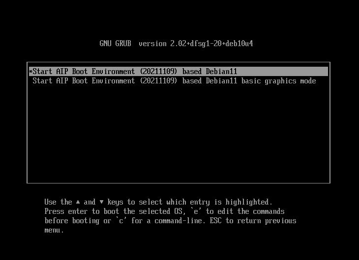 1) 顯示grub菜單時,選擇“Start AIP boot Environment (yyyyMMdd) based Debian11”並按鍵盤上的“e”。