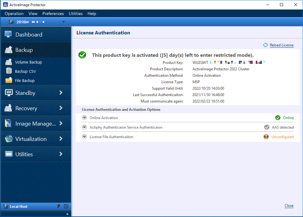 當您擁有ActiveImage Protector 2022 Cluster版本時,[ActiveImage Protector 2022 Cluster]會在[產品名稱]中顯示。