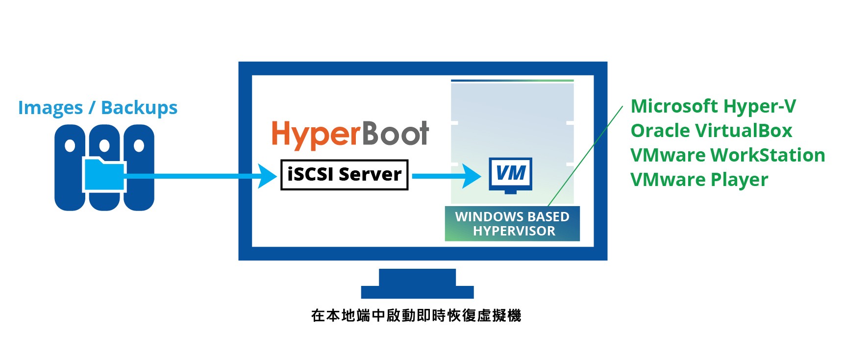 - 在執行虛擬化遷移測試時,您可以使用HyperBoot檢查實際的虛擬轉換狀態 HyperBoot直接從備份映像檔引導虛擬機,從而無需還原時間。